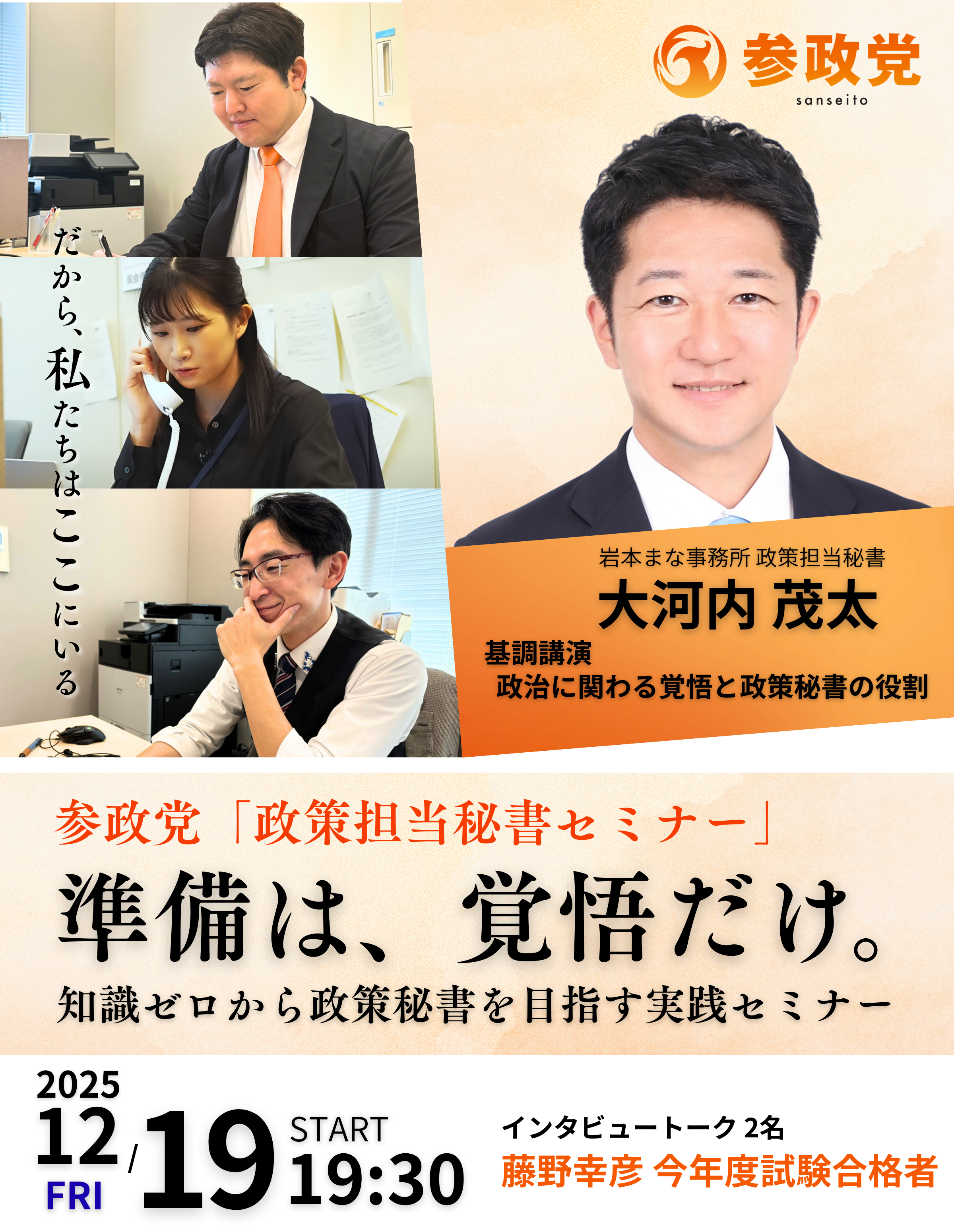 『政策担当秘書セミナー』とメール件名にご記入下さい。 履歴書送付先 人事部宛:hr@sanseito.jp 送付期限:2025/12/17(水)迄 ※提出期限を過ぎる可能性がある場合は、事前にご連絡ください。 ※履歴書など送付でお困りの点があれば、人事部宛にお問い合わせください |
